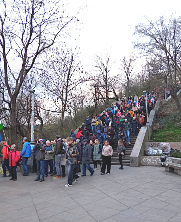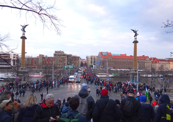 Demonstranti sestupují z Letné od Stalina na Čechův most.