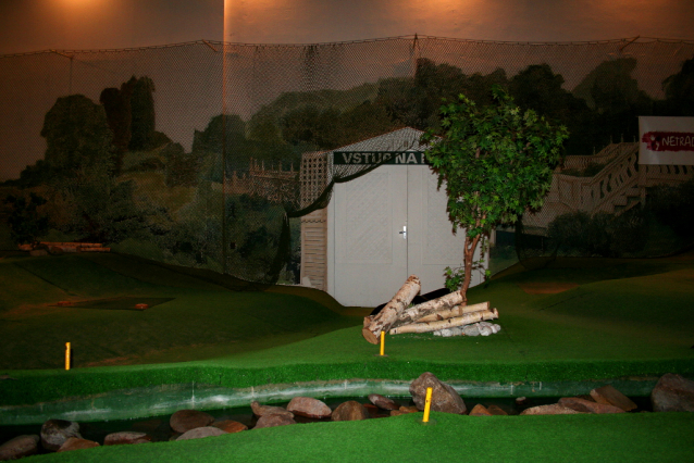 Indoor golf Erpet Praha. Jdeme umělým lesíkem po umělé trávě a co nevidíme... umělou chaloupku.