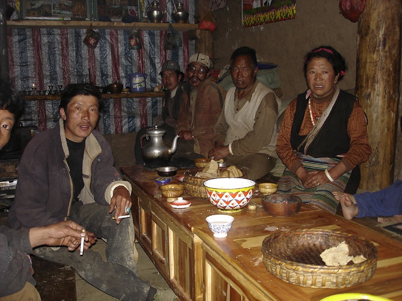 V dnešní době sice mají některé vesnice i vlastní vodní elektrárnu či jiný omezený zdroj elektrické energie, ale na běžné vaření se stále používá otevřený oheň. U ohniště se večer shromáždí celá rodina a všichni pozvaní hosté. Po krátkém posezení, lehké večeři a několika rundách slaného čaje s jačím máslem všichni jako na povel ulehnou na rozložené rohože či různé staré deky a brzy usnou.