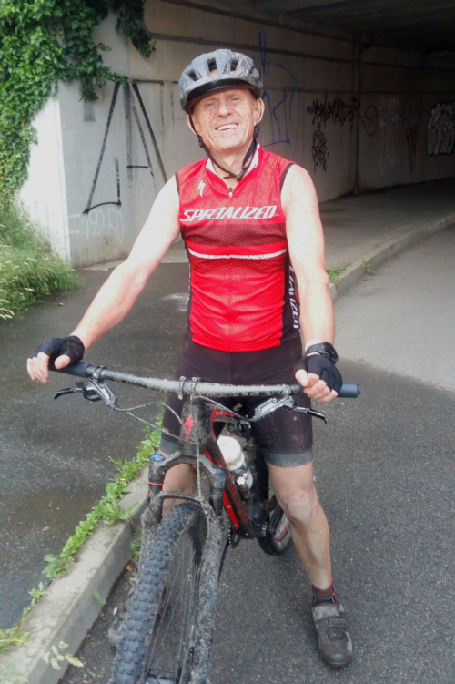 Na vršku dopití zásob z flašek, a už jen dolů, domů, do Podolí, do lékárny, a sakra, Jirka přichází s nápadem, že musíme do cíle, takže úplně zbytečně jedeme přes most přes Vltavu tam, vítězná cílová fotka a podání ruky, a zase zpátky, a po úplně volné cyklostezce do Modřan, zde se Jirka odpojuje, a já to mám ještě čtyři kilometry do Braníka a poslední dokopec, slézt z kola, zamknout jej do garáže, a tak jak jsem obalený bahnem lezu okolo deváté oblečený pod sprchu.