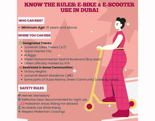 Dubajský úřad pro silnice a dopravu umožňuje řidičům elektrických koloběžek žádat o řidičské průkazy prostřednictvím digitálních kanálů. Řidičský průkaz zahrnuje sledování základní povinností - používat elektrické koloběžky a kola jen na na vyhrazených komunikacách, nosit přilbu, dodržovat dopravní předpisy a povolení od 16 let věku.