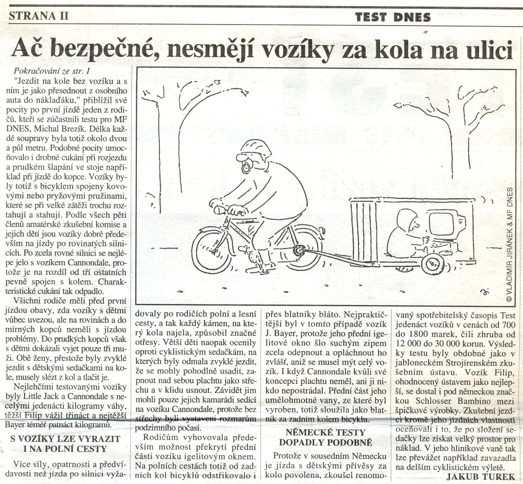 Spory o cyklovozíky se táhnou již dlouhá léta. V MF Dnes jsem vedl test těchto vozíků roku 1996. Dva z nich se prodávají dodnes. Státem certifikovaný Strojírenský zkušební ústav v Jablonci nad Nisou tehdy vydal verdikt, že včechny čtyři modely jsou dobře ovladatelné a bezpečné. To nezávisle na technicích ve zkušebně potvrdili rodiče s dětmi, které jsme do testu zapojili. Rozdílné hodnocení vozíků tedy vyplynulo jen z různého komfortu jednotlivých modelů.