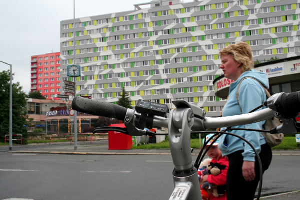 Elektrokolo Giant Twist Esprit stojí před kavárnou na Zahradním Městě v Praze.