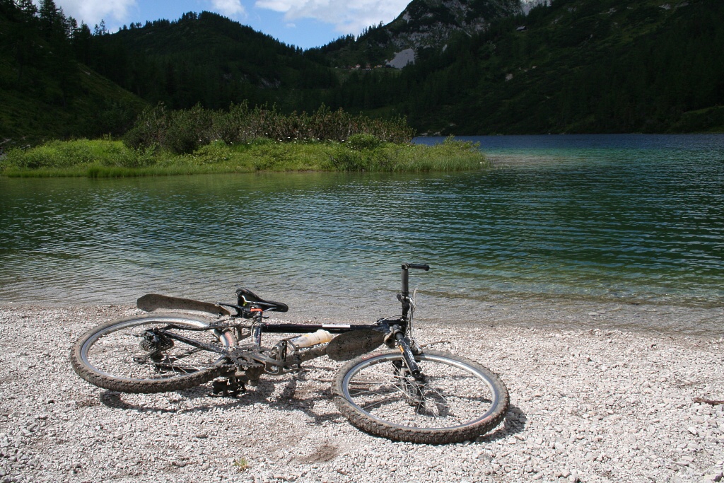 Po pár kilometrech končí asfalt a povrch cesty se mění na vápencovou drť. Zde odkládají kola rodinky s dětmi. Trasa se totiž prudce sklápí a dovádí nás k samotě Steirerseehütte. Dá se tu jednoduše najíst. Na jídlením lístku je špek, uzenina, mléko, brambory, chleba, pivo. Většina turistů sem ovšem chodí kvůli okouzlujícímu výhledu na jezero Steirersee (1445).