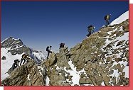 Mittelegihütte. Odsud se leze po hřebeni Mittelegi na vrchol Eigeru (3970 m n.m.), klasická túra 3 UIAA, 4-5 hodin, exponované. Za špatného počasí, když není nic vidět, velice nebezpečné. Krok vlevo - do díry, krok vpravo - do díry.