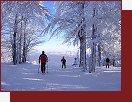 Fronta lyžařů na Jedlovou, v pozadí Tolštejn