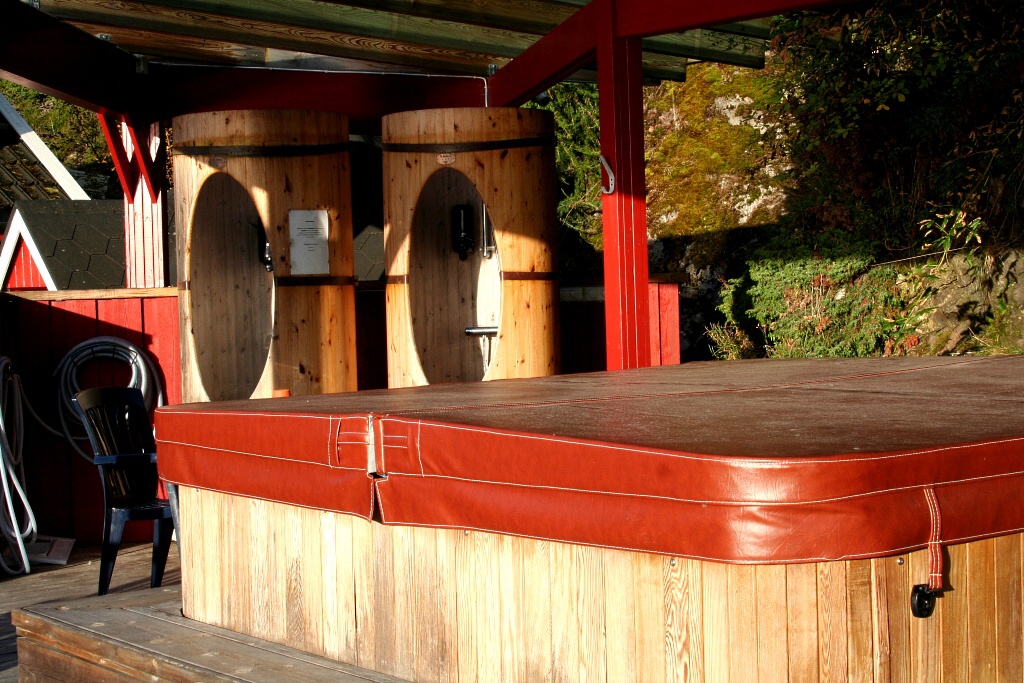 Norská rybářská základna Angelamfi Grefsnesvagen. Ohřát vodu do venkovní koupele si každý musí ohřát sám.