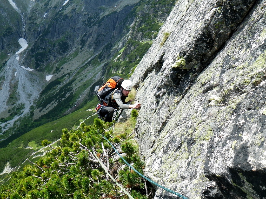 Cez knihu 5 UIAA. Laco kličkuje ve čtvrté délce po skalách mezi kosodřevinou