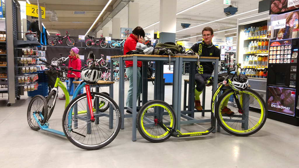 Setkání v Decathlonu: vlevo Yedoo Trexx, vpravo Crussis Urban a vlevo vzadu se schiovábí Yedoo Rodstr.