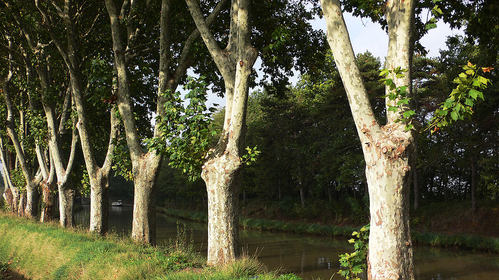 Canal du Midi. Platany stíní potahovou stezku na břehu.