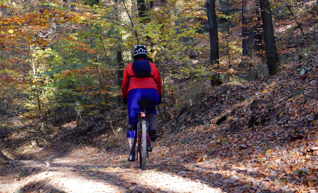 Cyklistka jede po cestě podél Šembery pod Kozojedy.