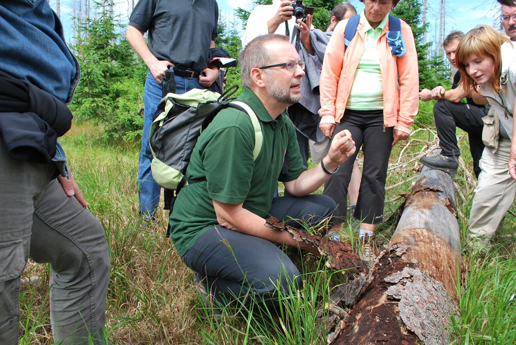 Ministr životního prostředí Ladislav Miko ukazuje, jakou roli hrají v přírodních procesech horské smrčiny různé druhy živočichů, v tomto případě hmyzu.