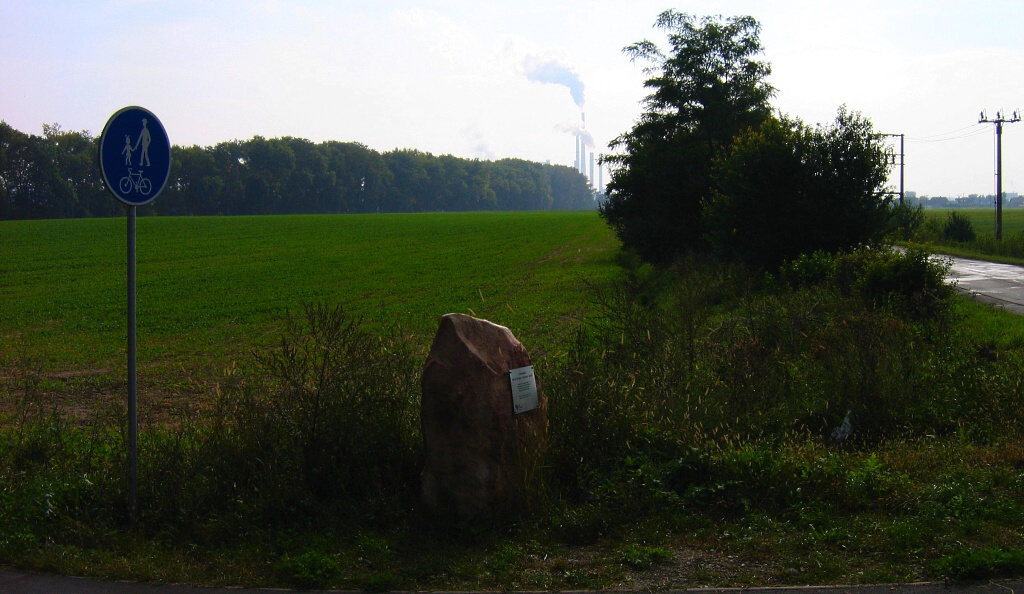 Samotný začátek cyklostezky osazený "pomníčkem" s informační tabulí. V pozadí mělnická elektrárna.