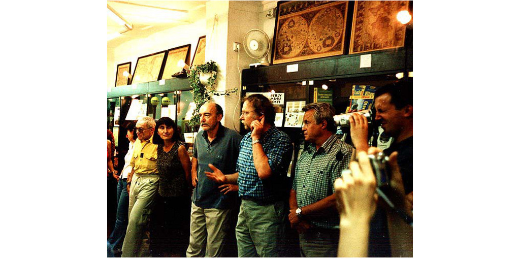 Hosté autogramiády Radana Kuchaře v roce 2003: zprava Jiří Novák, Petr Schnabl, Martin Kratochvíl, autorova dcera Jiřina Dienstbierová a Václav Širl. Filmuje Petr Šupich.