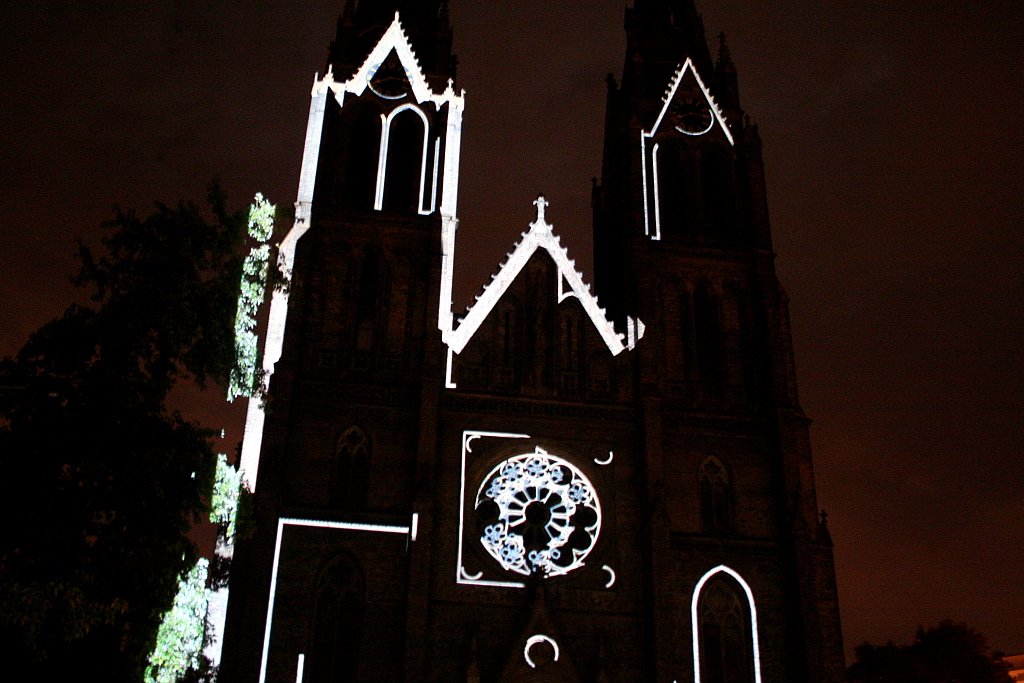 Point Line Surface Solid od Daniela Rossy. Kostel svaté Ludmily na Náměstí Míru v Praze.