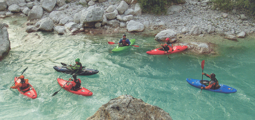 Soča, Kobarid. Tady končí pro vodáky těžké úseky a začíná pohodová kajakářská plavba.