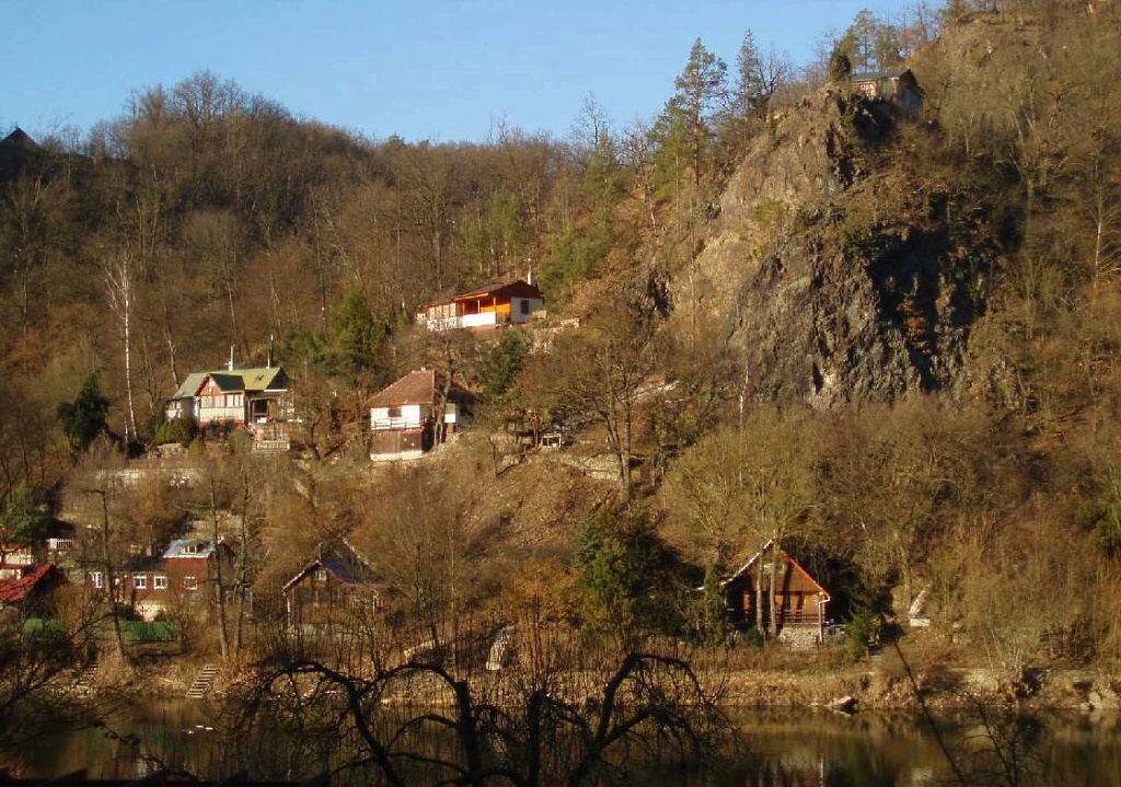Sázava, chaty ve skalnatém svahu proti Medníku.