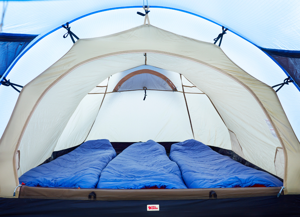 Tři spacáky ve stanu.