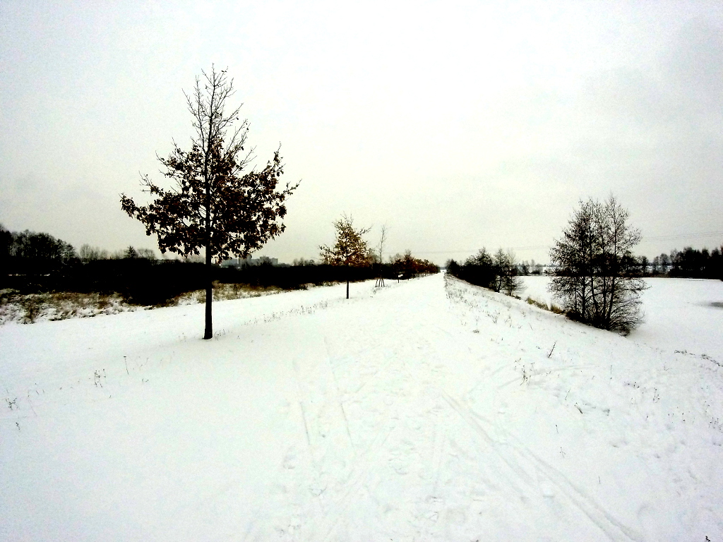 Běžkařská stopa na hrázi rybníka Šáteček v Milíčovském háji v Praze.