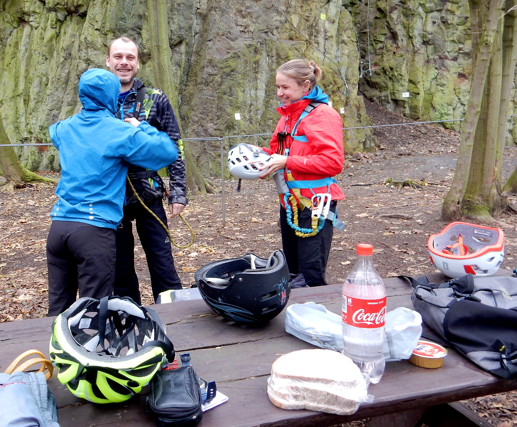 Feráta Slaný. Přípravu na lezení zpříjemňuje stůl, lavice a ohniště pod skalami.