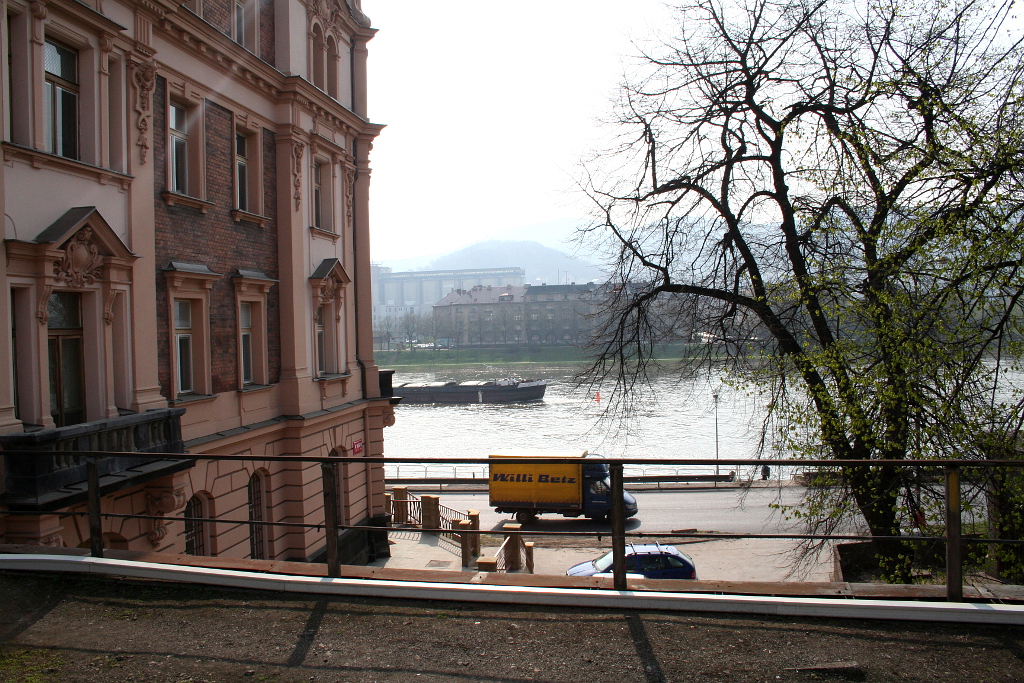 Labe, Ústí nad Labem. Pohled z nádraží přes Labe na Střekovské nábřeží.