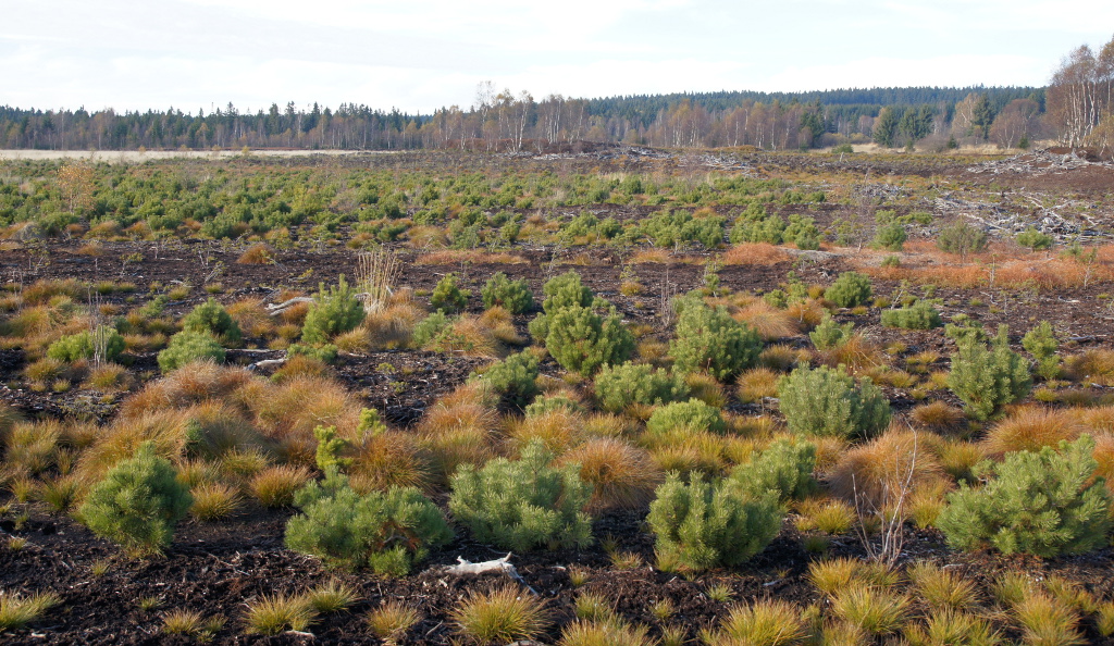 Řádková výsadba borovice bažinné provedená po ukončení těžby na Perninském rašeliništi.