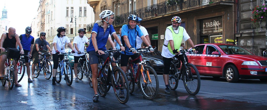 Na semaforech před komplikovanou křižovatkou na Palachově náměstí. Zleva Introvič, Bém, Polák.