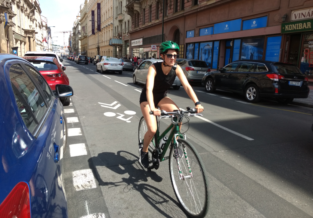 Cyklistka jede Hybernskou ulicí k Prašné bráně.