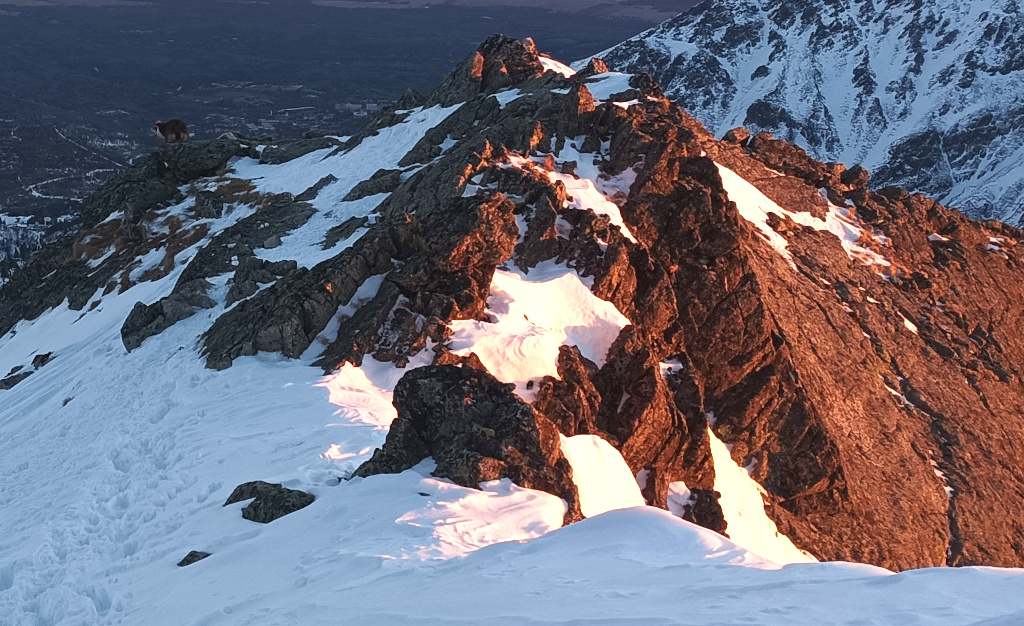 Kamzík se vyhřívá na posledním večerním slunci na Jižním hřebenu Lomnického štítu.