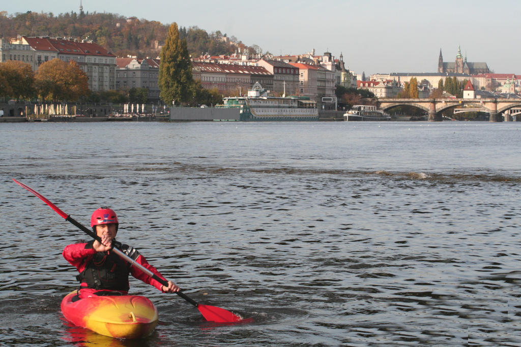 Bob v kajaku na Vltavě s Hradčany v zádech.