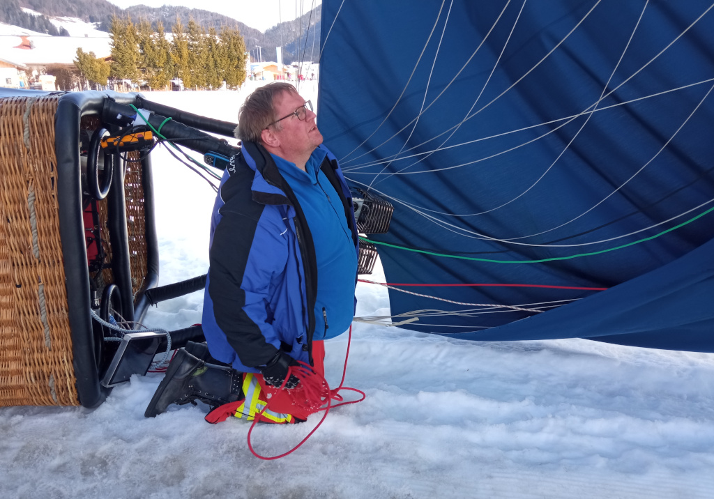 Pilot Felix Walde vystupuje z horokovzdušného balonu po přistání.