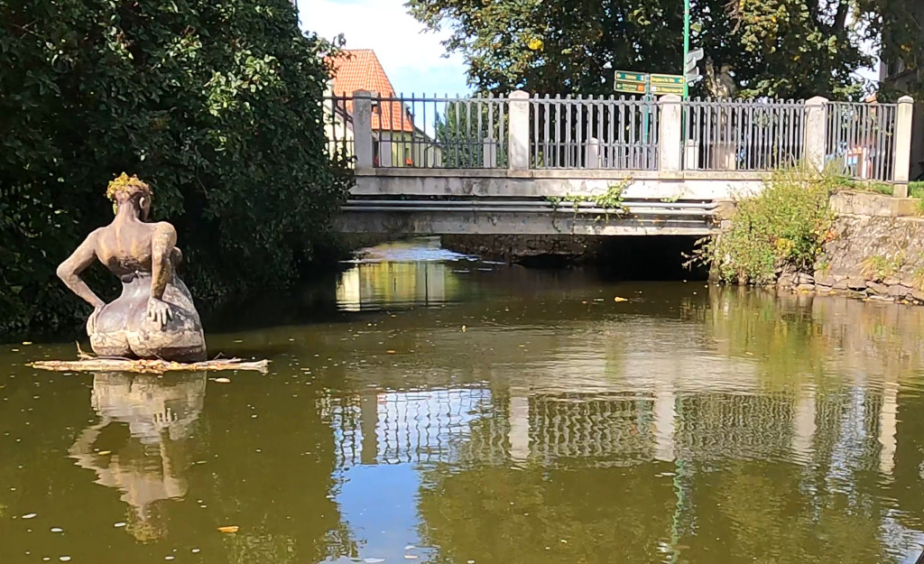 Zlatá stoka, socha Vodní žena u mostu Dukelská ulice, Třeboň.