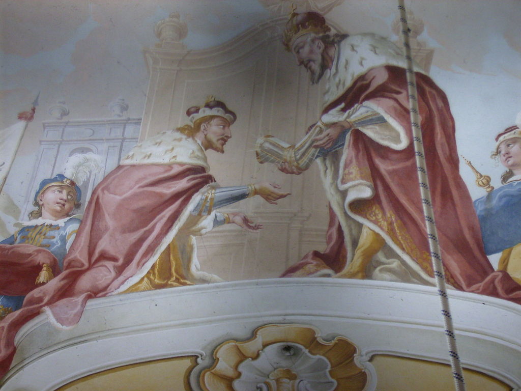 Třeboň, kaple svatého Víta. Jindřich Ptáčník předává paži svatého Víta svatému Václavu roku 929.