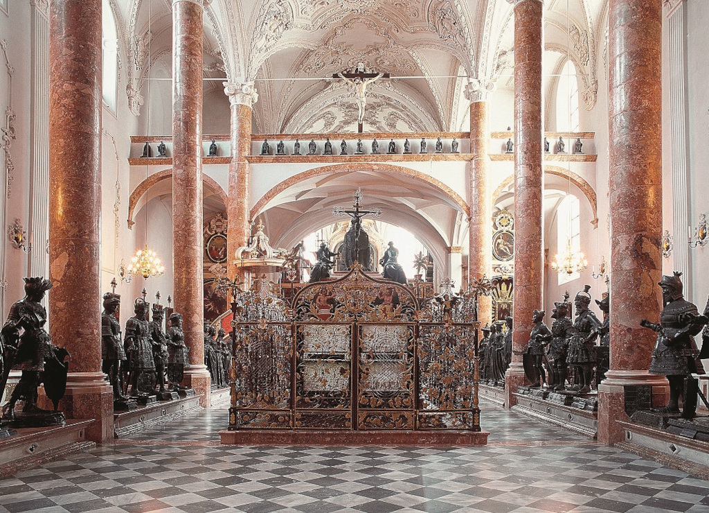 28 bronzových soch v životní velikosti střeží prázdný hrob císaře Maxmiliána v kostele Hofkirche, Innsbruck.