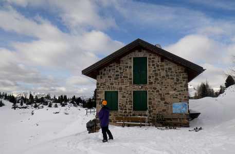 Všuchni lyžaři kromě nás proto zastaví na velkém neplaceném parkovišti pod Passo Rolle u chaty Venezia a po sjezdovce sjedou k dolní stanici lanovky na Tognazzu (cca 1900). Tam nalepí stoupací pásy a v klidu mírně stoupají překrásným modřínovým a smrkovým lesem pohodlnou cestou až k chatě Rifugio Colbricon (1927).