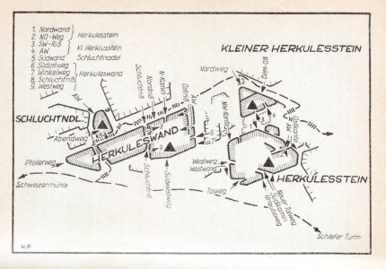 Po žluté turistické značce obejdeme Herkulův masiv ze severu. Lehkým komínkem (I) vlezeme sedla mezi Herkuleswand (vpravo) a Kleiner Herkulesstein (vlevo). Za ním odbočíme doleva dolů mezi vysoké temné skály. Ocitneme se na na jakémsi náměstí, které projdeme až do jeho jihovýchodního cípu.
