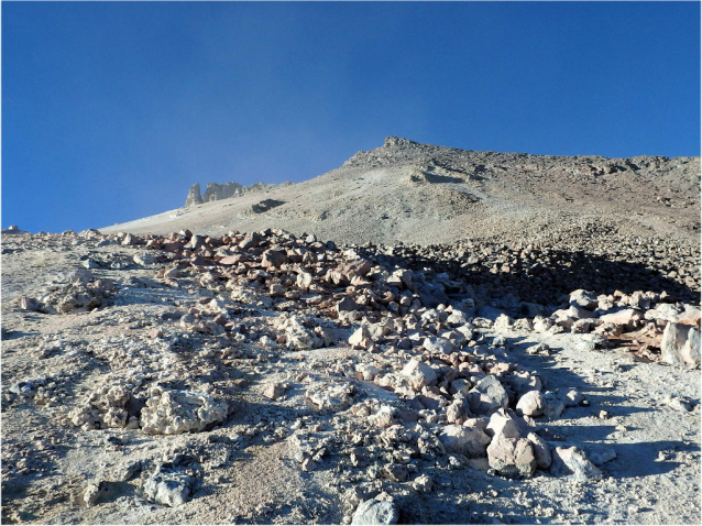 Uturuncu, podvrcholové svahy jsou tvořeny rozpadlým andzitem.