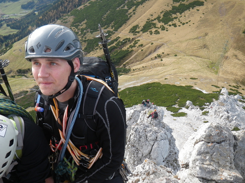 Nádherný hřeben má ovšem také nevýhody. Hlavní je, že za hezkých dní je přeplněný. My jsme na něm minulou neděli registrovali celkem šestnáct horolezců. Naštěstí nebylo až moc kam spěchat, a tak jsme si dávali gentlemansky přednost.