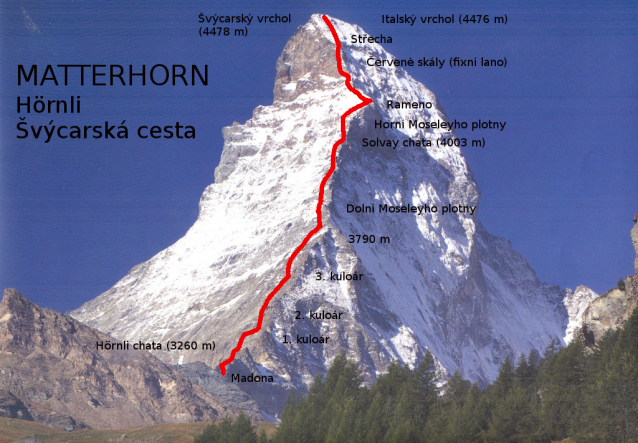 Monte Cervino. Hörnligrat (Swiss route), Liongrat (Italian Route), Zmuttgrat, Furggengrat. Zermatt, Breuil Cervinia. Hörnli Hütte, Rifugio Carrel, Solvay Hütte.