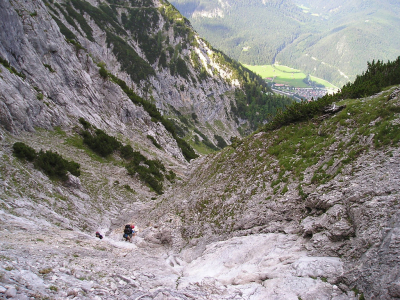 Sestup z vrcholu vede jihovýchodním hřebenem, střídavě pěšky, střídavě slaněním, vcelku nekomplikovaně, potom po vychozené cestě a suťovištěm kolem Dammkarrhütte (asi 45 minut) a pak hodinu a půl do Mittenwaldu.