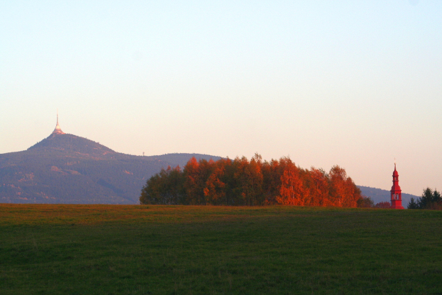 Ještěd. Pod ním vykukuje věž kostela v Křižanech.