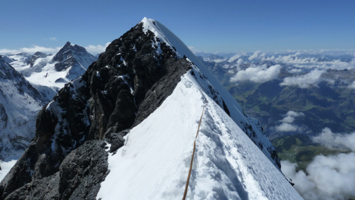 V deset hodin stojíme na vrcholu skalní věže Grossen Turm (3689) a kocháme se pohledem na nejstrmější výšvih hřebene Mittellegi. Jižní stěna přiléhající ke hřebenové hraně je sice suchá, ale převislá, a cesta je tak vedena vpravo severní stěnou. Výstupová linie je po většinu dne ve stínu a dlouhé úseky jsou pokryté sněhem. Právě tento úsek představoval největší problém při dávných pokusech o výstup hřebenem. Při prvovýstupu v roce 1921 se Fritz Amatter v těchto místech jistil pomocí šestimetrové dřevěné tyče s hákem na konci. Při pohledu na sníh a led v trase výstupu bereme za vděk pomocnými fixy a rychle zdoláváme strmý terén.