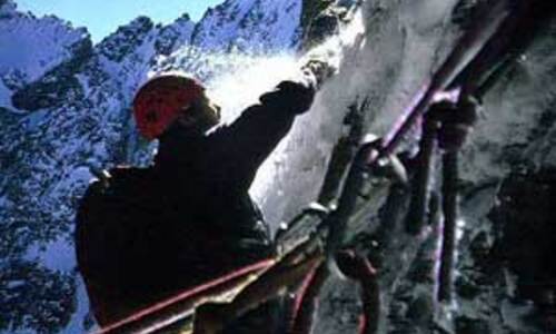 Hoé pustí cepíny, které se mu houpou na zápěstích, zabere a holýma rukama se porve se skálou studenou hodně pod nulou. Takhle vyleze dvanáct pětkových metrů s mačkami na nohou. Závěr této krátké, ale výživné délky tvoří žlab s hlubokým prašanem, do kterého se Hoé ponoří až po lokty.