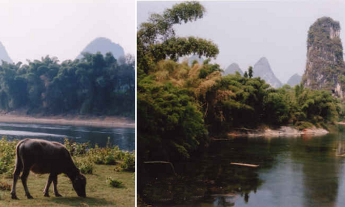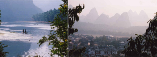 Kolem města se vypínají homolovité a dost příkré, skalnaté kopce. Napočítali jich tady dvacet tisíc! Skoro všechny se zrcadlí v čisté vodě řeky Li. Jsou podél ní rozsázené jako bonbony. Mají většinou formu cukrové homole.