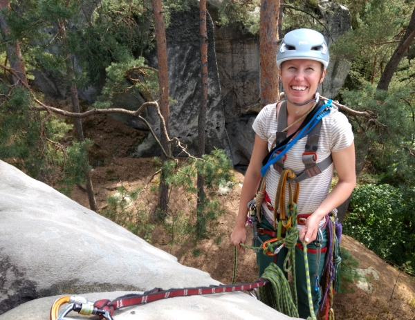 Orloj, Hanka prolézá skalní okno na Normálce.