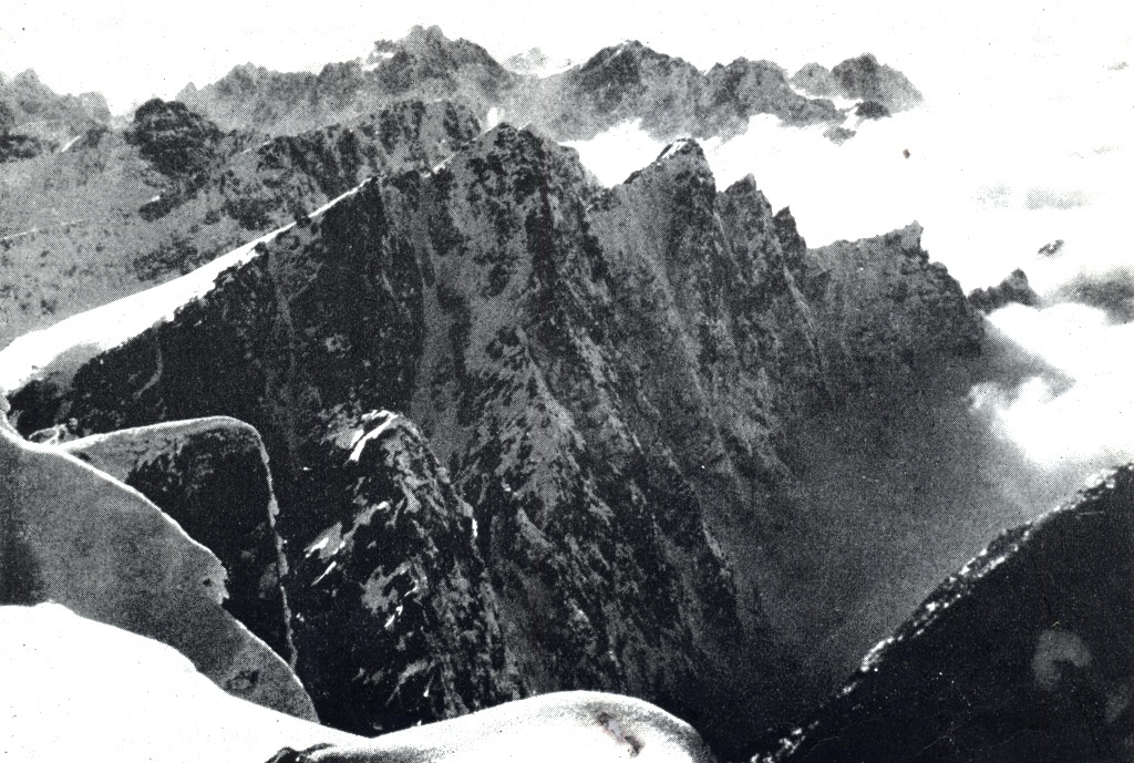 Jistím vklíněn v nepohodlné rozsoše, Julo pokračuje velmi těžkým, asi desetimetrovým kolmým prahem. Pomalu, velmi pomalu zdolává práh a mizí mi za jeho okrajem. Dalším komínem přerušovaným prahy přicházíme pod druhý, stejně mohutný a strmý výšvih. Dívám se na hodinky. Nechci věřit svým očím - již 16 hodin.