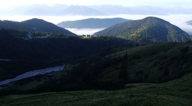 Dachstein, ranní výhled zpod Dachsteinu ke Schladmingu.