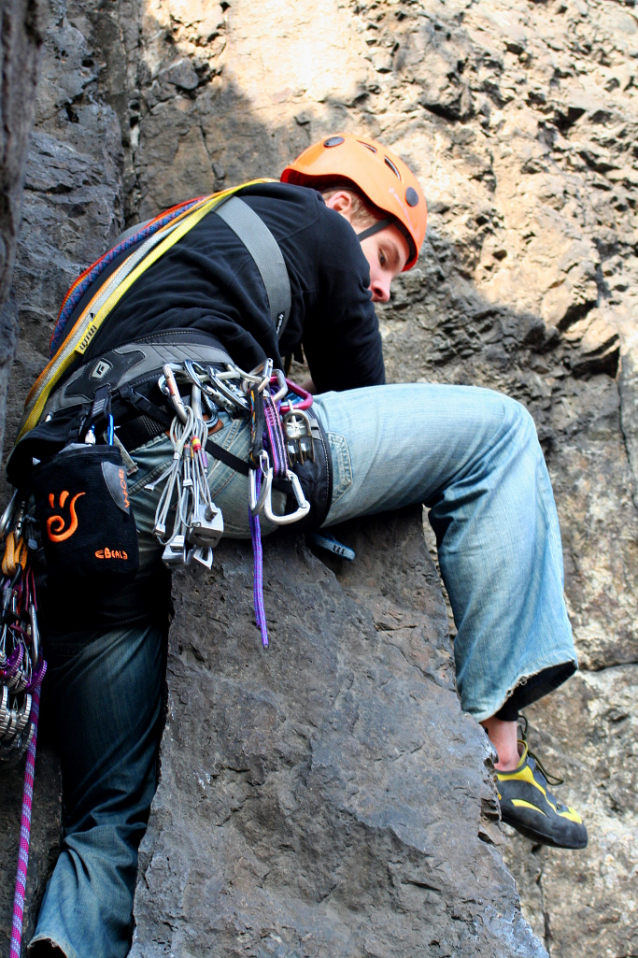 Řež, Kůň 4+. Lukáš dělá klíčový krok na velký skalní hrot.