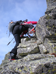 6. Poslední šestá lanová délka nás vede po klasickém tatranském zasněženém skalním hřebenu (1-2) na vrchol (smyčky).