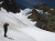 Kousek slézáme do sedla, a následuje třikrát slanění na sníh, obouváme štajgajzny, chápeme se motyk, navazujeme se a vážeme meziuzly jak v dvoupalcové tištěné abecedě. Od skály je to sotva třicítka sklonu, následuje téměř placatý úsek a přicházíme ke klíčovému místu sestupu, asi dvousetmetrovému žlabu sklonu pětačtyřicet. Podmínky jsou naprosto ideální, jsou asi tři nad nulou, hrubý firn je uvnitř tvrdý a na povrchu změklý, přechod tvrdosti je plynulý, a tak se dá ideálně zakopávat a zarážet Eispickel takže jsme za chvíli zase na placatém, a přicházíme na skálu, po které slaňujeme natřikrát na suť a sníh, kde veškeré obtíže končí.